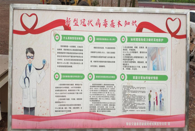 一是創(chuàng)新宣傳形式,利用公司QQ群、微信群、推送《中華人民共和國傳染病防治法》、《四川省應(yīng)對新冠肺炎疫情分區(qū)分級差異化防控指南(第二版)》、《雅安市新型冠狀病毒肺炎疫情防控工作要點指引》等法律法規(guī),每日持續(xù)有效的傳播疫情防控的信息,加大健康教育宣傳,引導(dǎo)職工不信謠不傳謠,營造良好的輿論環(huán)境。二是落實責(zé)任主體,在公司、各項目部張貼疫情防控法制宣傳展板、懸掛宣傳橫幅、發(fā)放防控宣傳冊,設(shè)立疫情防控教育專欄,向項目參建人員宣講疫情防控知識,做好疫情群防群治工作,營造濃厚的防控宣傳氛圍。三是精準(zhǔn)發(fā)力,組織已進(jìn)場勞務(wù)人員開展疫情防控及復(fù)工復(fù)產(chǎn)安全教育培訓(xùn),確保項目復(fù)工復(fù)產(chǎn)和疫情防控工作有序推進(jìn)。