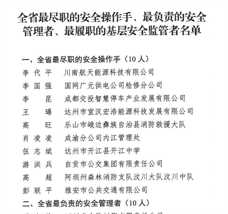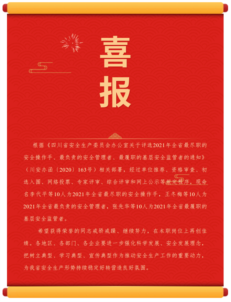 此次評選活動,最終命名“全省最盡職的安全操作手、最負責(zé)的安全管理者、最履職的基層安全監(jiān)管者”各10名。彭聯(lián)平通過單位自薦、資格審查、初選入圍、網(wǎng)絡(luò)投票、專家評審、綜合評審和網(wǎng)上公示層層選拔,最終獲得“2021年全省最盡職的安全操作手”稱號,是雅安市唯一獲此殊榮的個人。