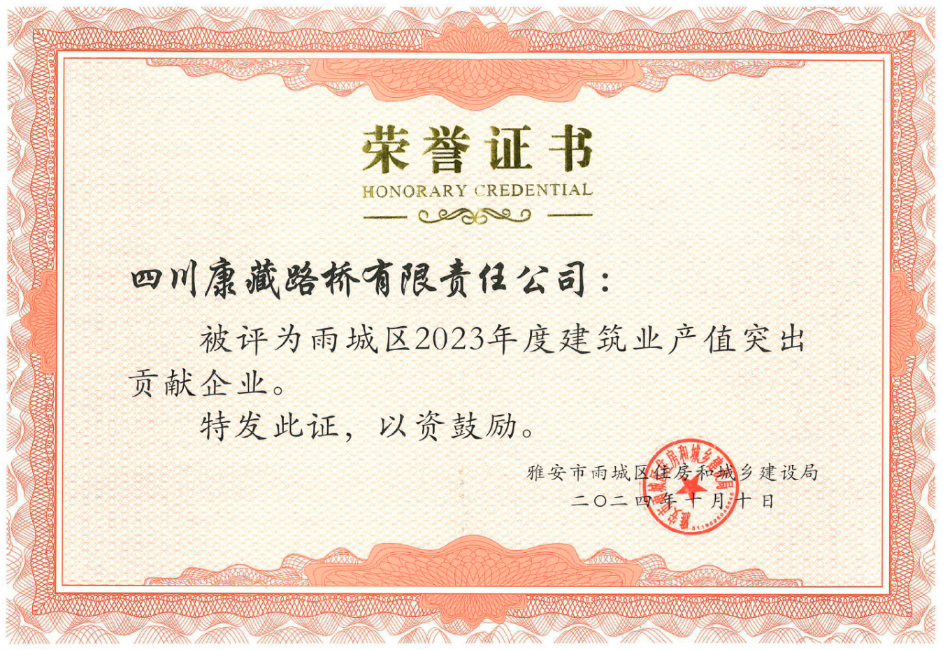 今年10月,路橋公司被雅安市雨城區(qū)住房和城鄉(xiāng)建設(shè)局評為“雨城區(qū)2023年度建筑業(yè)產(chǎn)值突出貢獻(xiàn)企業(yè)”。下一步,路橋公司將持續(xù)貫徹落實市委、市政府決策部署,把學(xué)習(xí)貫徹落實黨的二十大精神與生產(chǎn)經(jīng)營工作結(jié)合起來,發(fā)揮項目引領(lǐng)支撐作用,為地方經(jīng)濟(jì)的發(fā)展持續(xù)貢獻(xiàn)力量。