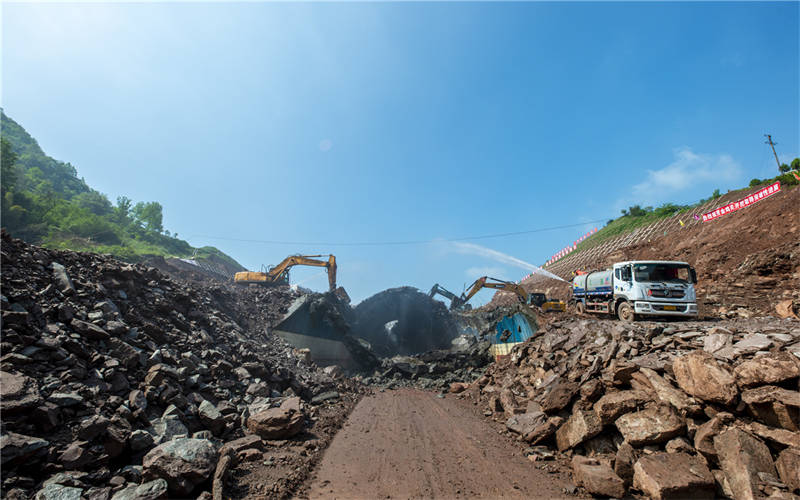 上午10點(diǎn),金雞關(guān)隧道開挖現(xiàn)場(chǎng),多臺(tái)大型破碎機(jī)和灑水除塵設(shè)備同時(shí)按下啟動(dòng)鍵,建設(shè)的“沖鋒號(hào)”奏響。金雞關(guān)隧道開挖是整個(gè)項(xiàng)目取得突破性進(jìn)展的標(biāo)志,是路基鋪設(shè)和邊坡抗滑裝等施工開展的基礎(chǔ)。目前土方開挖已完成365萬(wàn)方,邊坡施工已完成8級(jí),項(xiàng)目整體推進(jìn)有序,預(yù)計(jì)兩個(gè)月完成隧道部分開挖。