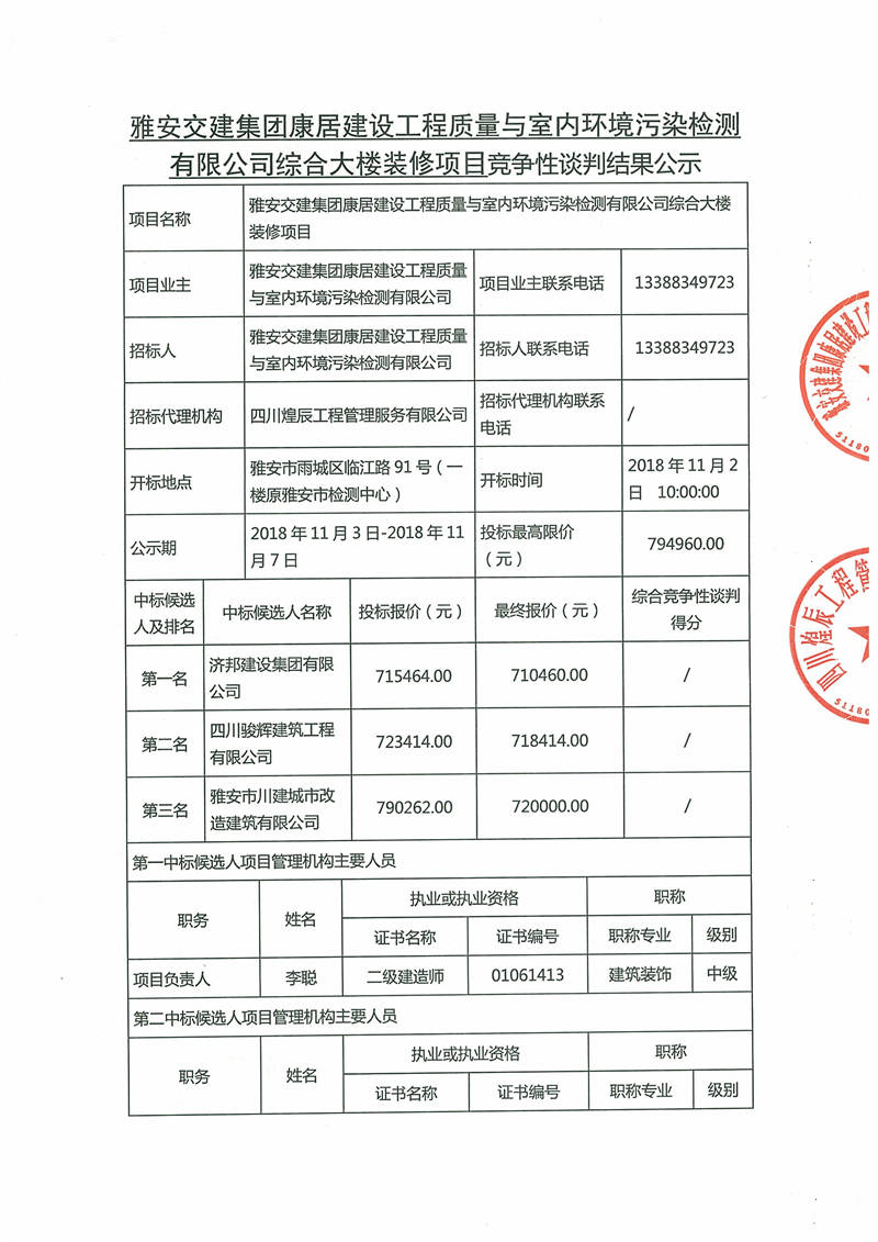 雅安交建集團康居建設工程質(zhì)量與室內(nèi)環(huán)境污染檢測有限公司綜合大樓裝修項目競爭性談判結(jié)果公示