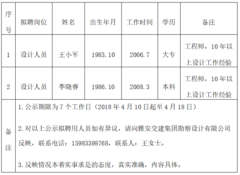 通過公開報名、資格審查、面試等程序,經(jīng)雅安交建集團勘察設(shè)計有限公司研究擇優(yōu)確定以下2名擬聘用人員,現(xiàn)公示名單如下:
