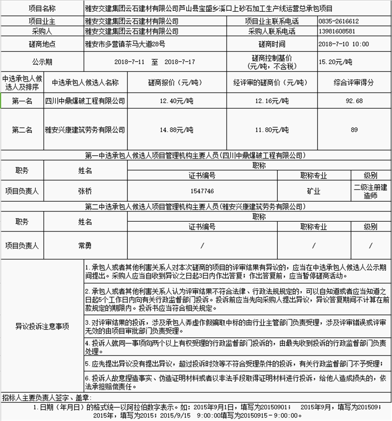 雅安交建集團云石建材有限公司蘆山縣寶盛鄉(xiāng)溪口上砂石加工生產(chǎn)線運營總承包項目中選承包人公示