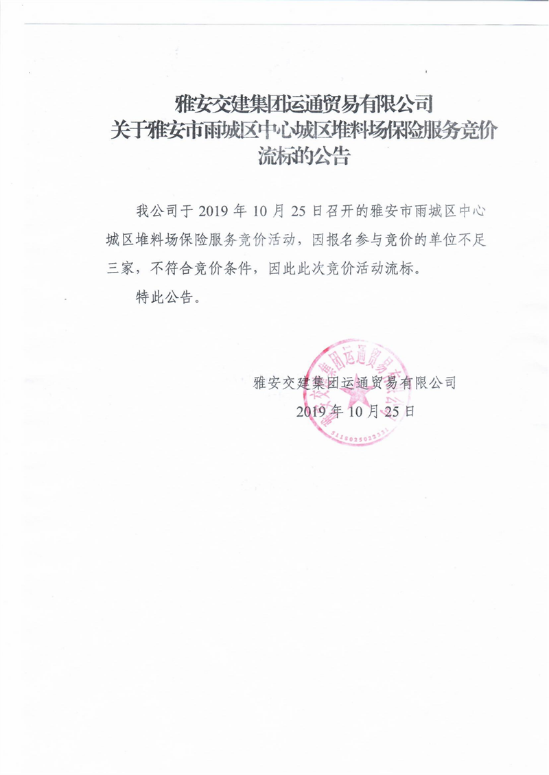雅安交建集團(tuán)運(yùn)通貿(mào)易有限公司關(guān)于雅安市雨城區(qū)中心城區(qū)堆料場保險(xiǎn)服務(wù)競價(jià)流標(biāo)的公告