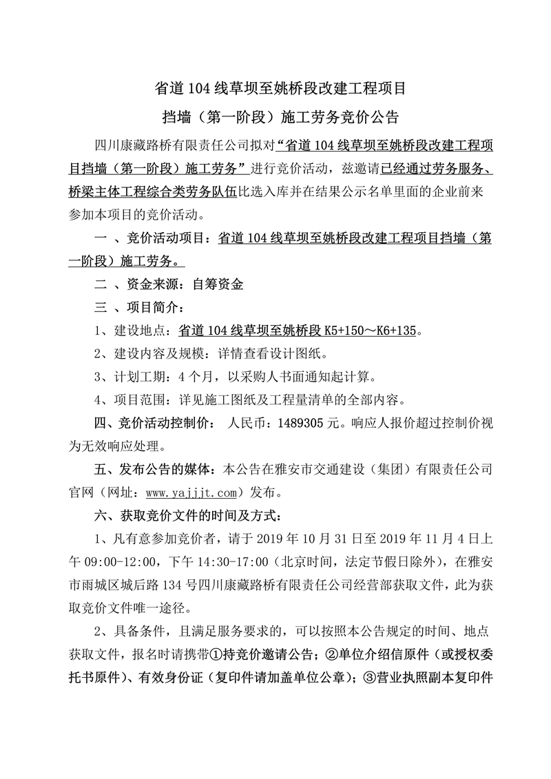 四川康藏路橋有限責任公司省道104線草壩至姚橋段改建工程項目擋墻(第一階段)施工勞務(wù)競價公告