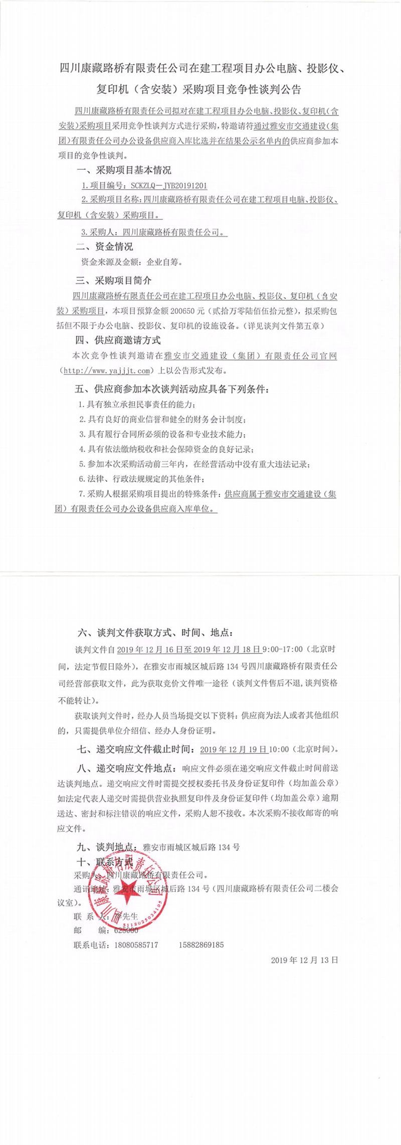四川康藏路橋有限責(zé)任公司在建工程項目辦公電腦、投影儀、復(fù)印機(含安裝)采購項目競爭性談判公告
