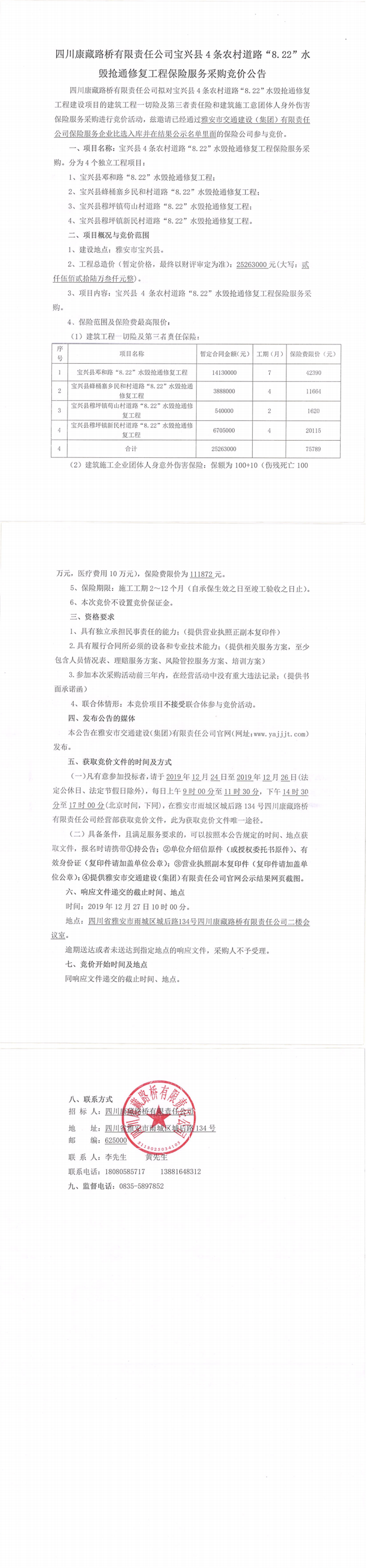 四川康藏路橋有限責任公司寶興縣4條農(nóng)村道路“8.22”水毀搶通修復(fù)工程保險服務(wù)采購競價公告