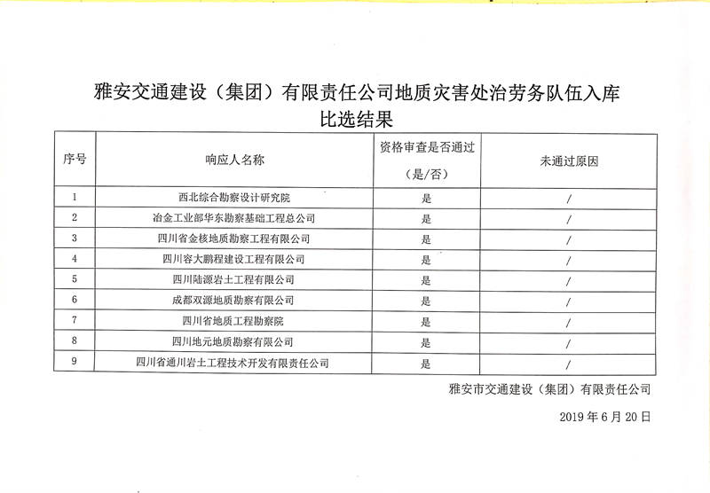 雅安交通建設(shè)(集團(tuán))有限責(zé)任公司地質(zhì)災(zāi)害處治勞務(wù)隊伍入庫比選結(jié)果