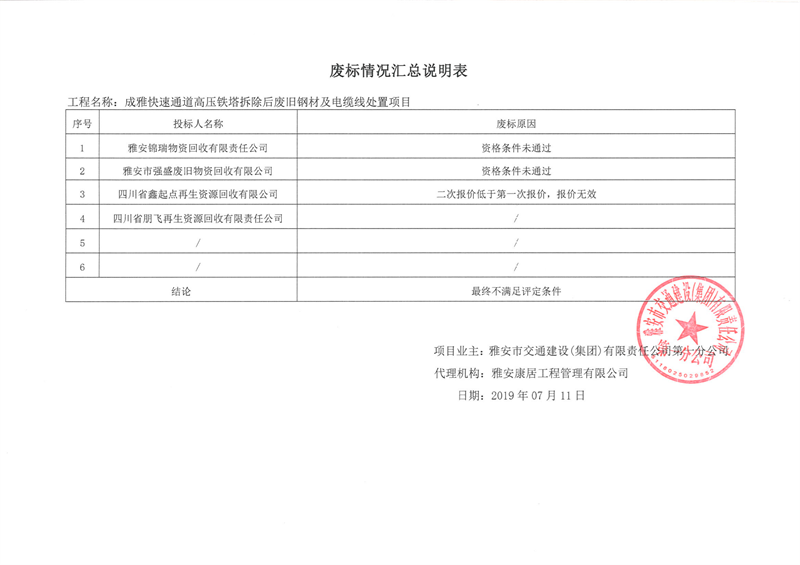 雅安市交通建設(shè)(集團(tuán))有限責(zé)任公司第一分公司成雅快速通道高壓鐵塔拆除后廢舊鋼材及電纜線處置項(xiàng)目廢標(biāo)情況匯總說明表