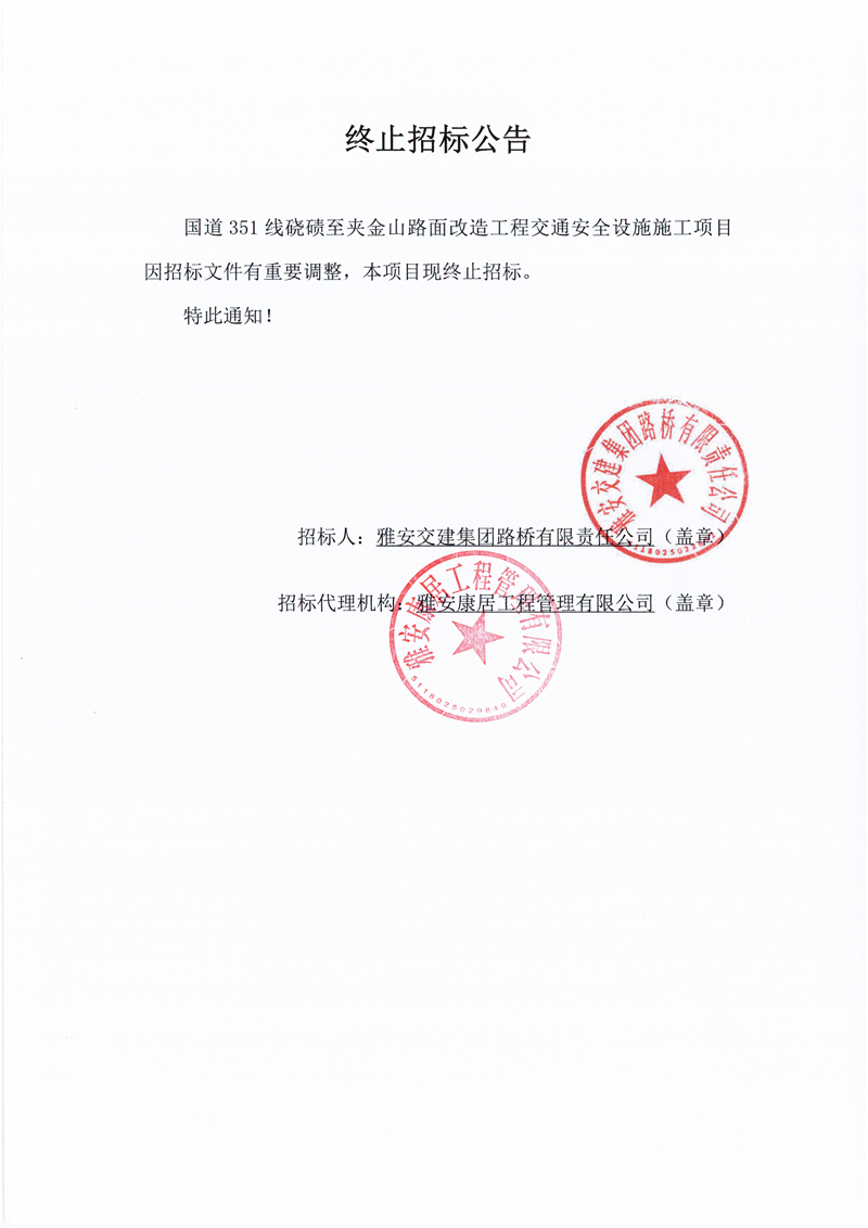 雅安交建集團(tuán)路橋有限責(zé)任公司國道351線磽磧至夾金山段路面改造工程交通安全設(shè)施施工項目終止招標(biāo)公告