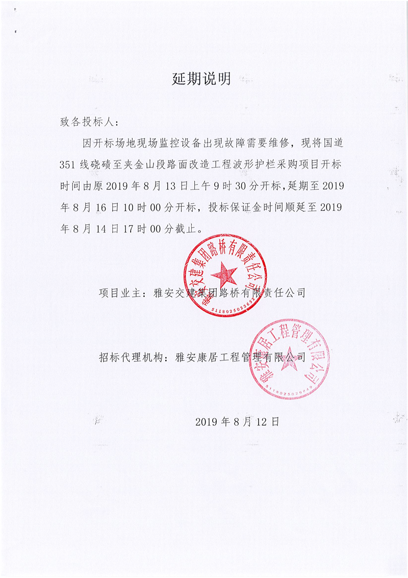 雅安交建集團路橋有限責(zé)任公司國道351線磽磧至夾金山段路面改造工程波形護欄采購延期說明