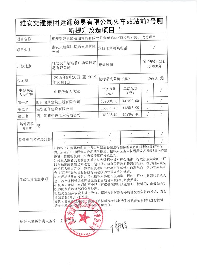 雅安交建集團運通貿(mào)易有限公司火車站站前廣場3號廁所改造提升項目(第二次)競爭性談判結果公示