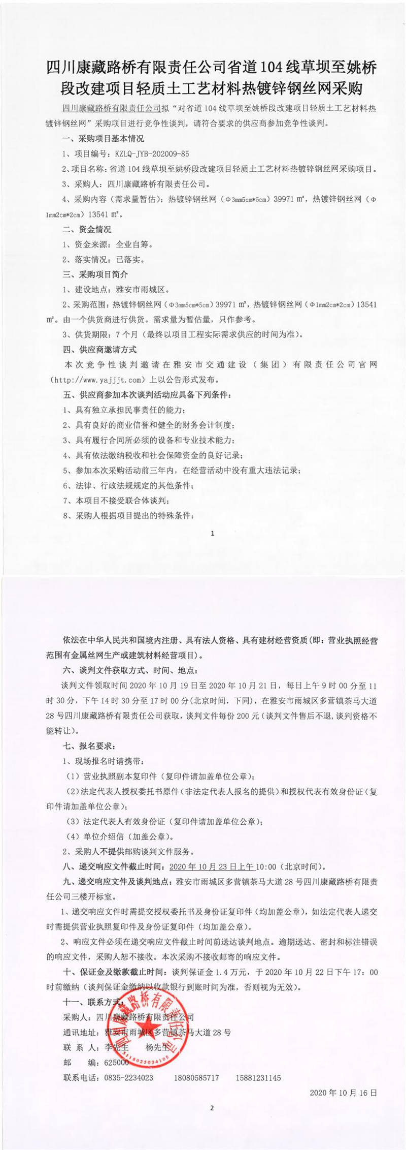四川康藏路橋有限責(zé)任公司省道104線(xiàn)草壩至姚橋段改建項(xiàng)目輕質(zhì)土工藝材料熱鍍鋅鋼絲網(wǎng)采購(gòu)競(jìng)爭(zhēng)性談判公告