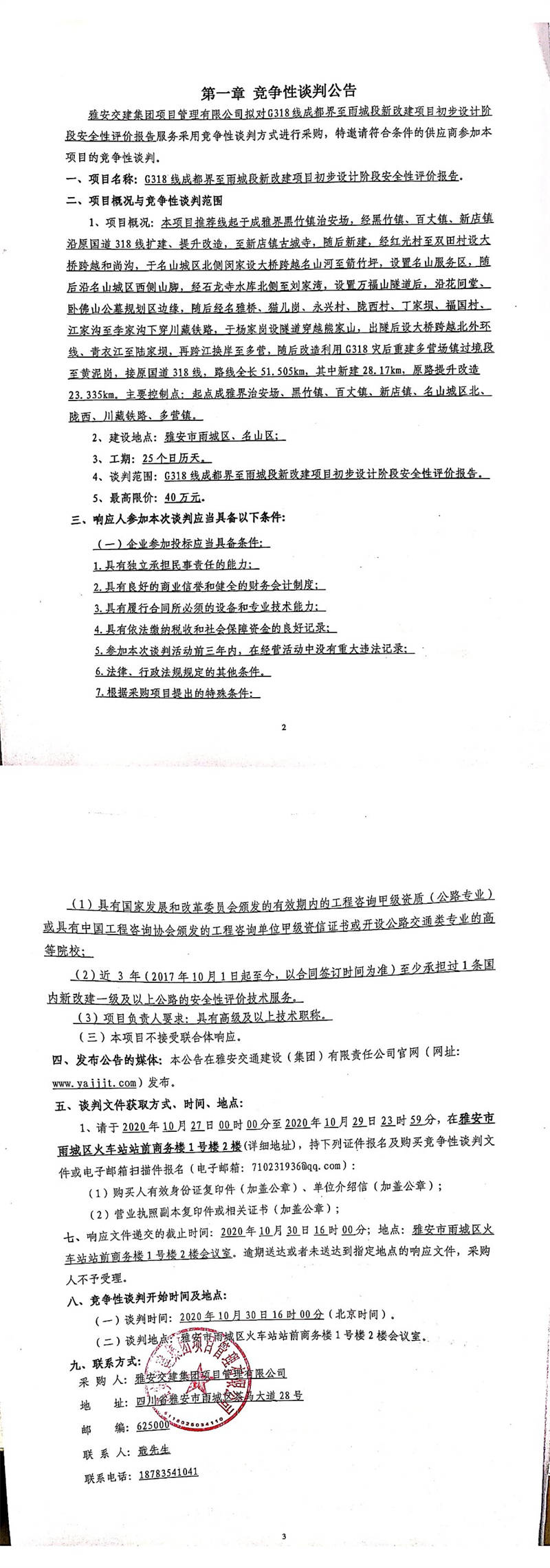 雅安交建集團(tuán)項(xiàng)目管理有限公司G318線成都界至雨城段新改建項(xiàng)目初步設(shè)計(jì)階段安全性評價(jià)報(bào)告競爭性談判公告