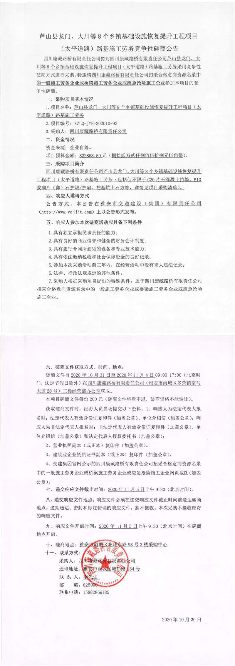 四川康藏路橋有限責任公司蘆山縣龍門、大川等8個鄉(xiāng)鎮(zhèn)基礎設施恢復提升工程項目(太平道路)路基施工勞務競爭性磋商公告
