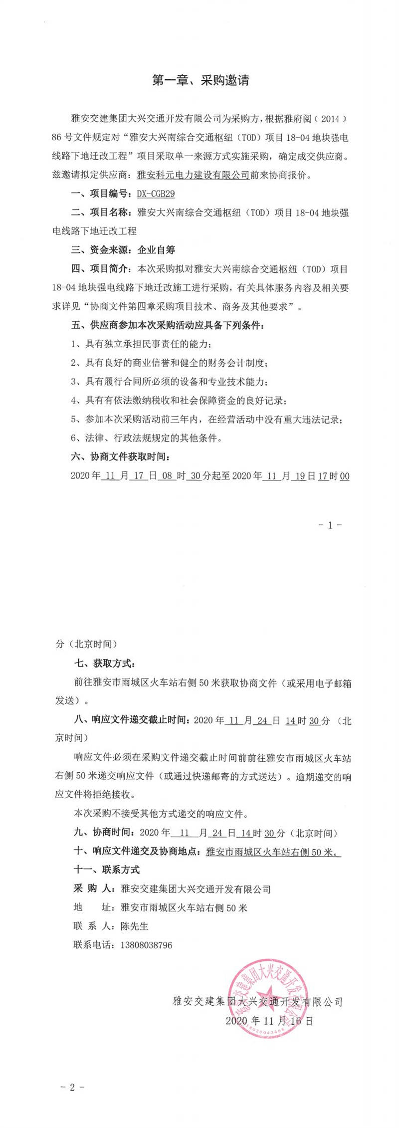 雅安交建集團(tuán)大興交通開(kāi)發(fā)有限公司雅安大興南綜合交通樞紐(TOD)項(xiàng)目18-04地塊強(qiáng)電線路下地遷改工程單一來(lái)源采購(gòu)邀請(qǐng)