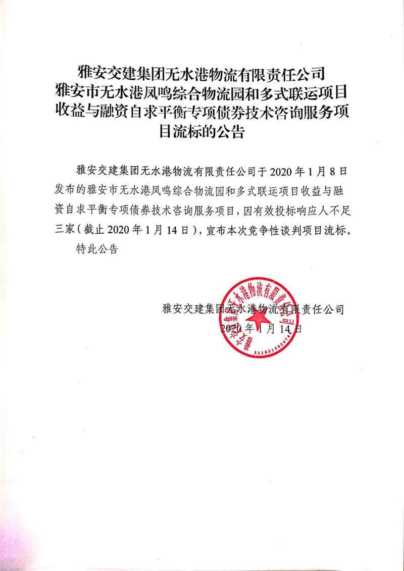 雅安交建集團無水港物流有限責任公司雅安市無水港鳳鳴綜合物流園和多式聯(lián)運項目收益與融資自求平衡專項債券技術咨詢服務項目流標的公告