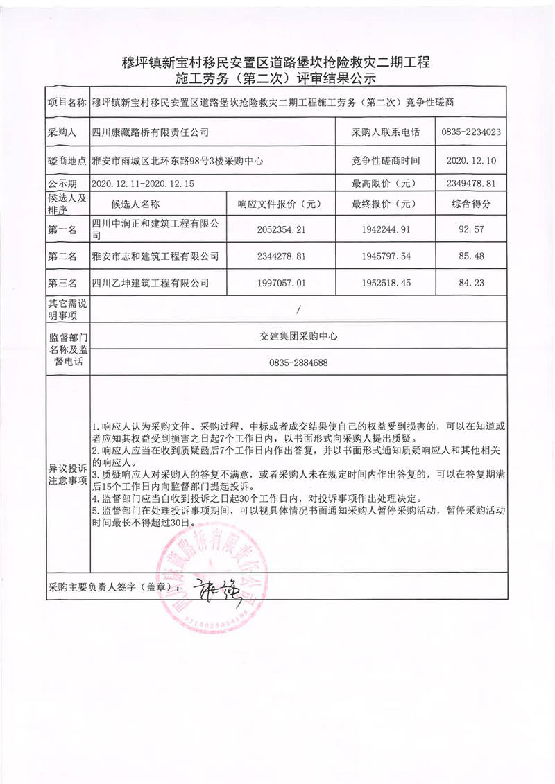 四川康藏路橋有限責(zé)任公司穆坪鎮(zhèn)新寶村移民安置區(qū)道路堡坎搶險(xiǎn)救災(zāi)二期工程施工勞務(wù)(第二次)評(píng)審結(jié)果公示