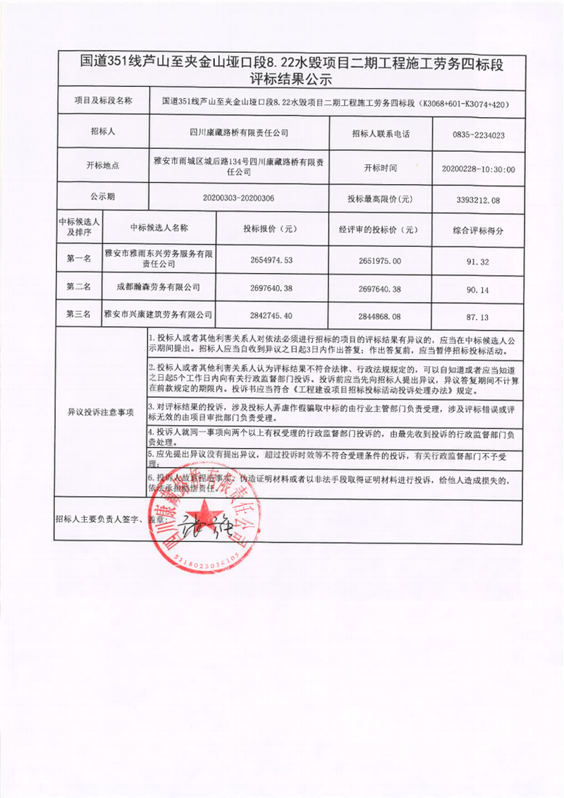 四川康藏路橋有限責(zé)任公司國道351線蘆山至夾金山埡口段8.22水毀項(xiàng)目二期工程施工勞務(wù)四標(biāo)段評標(biāo)結(jié)果公示