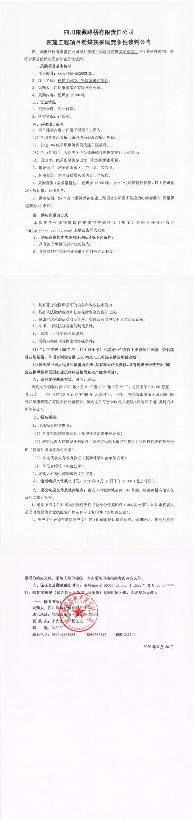 四川康藏路橋有限責(zé)任公司在建工程項(xiàng)目粉煤灰采購競(jìng)爭(zhēng)性談判公告