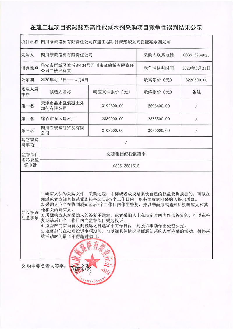 四川康藏路橋有限責任公司在建工程項目聚羧酸系高性能減水劑采購項目競爭性談判結果公示