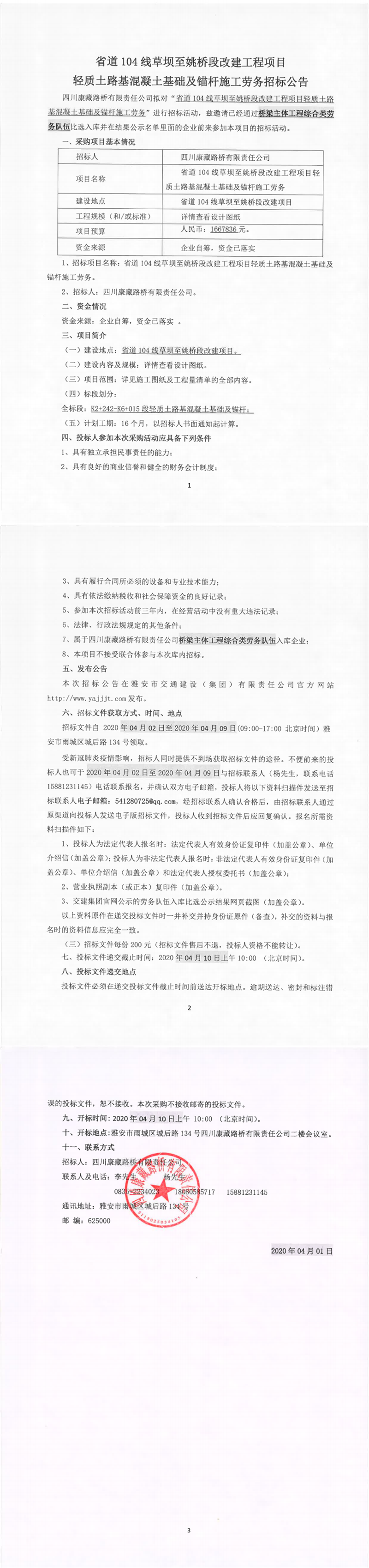 四川康藏路橋有限責任公司省道104線草壩至姚橋段改建工程項目輕質土路基混凝土基礎及錨桿施工勞務招標公告