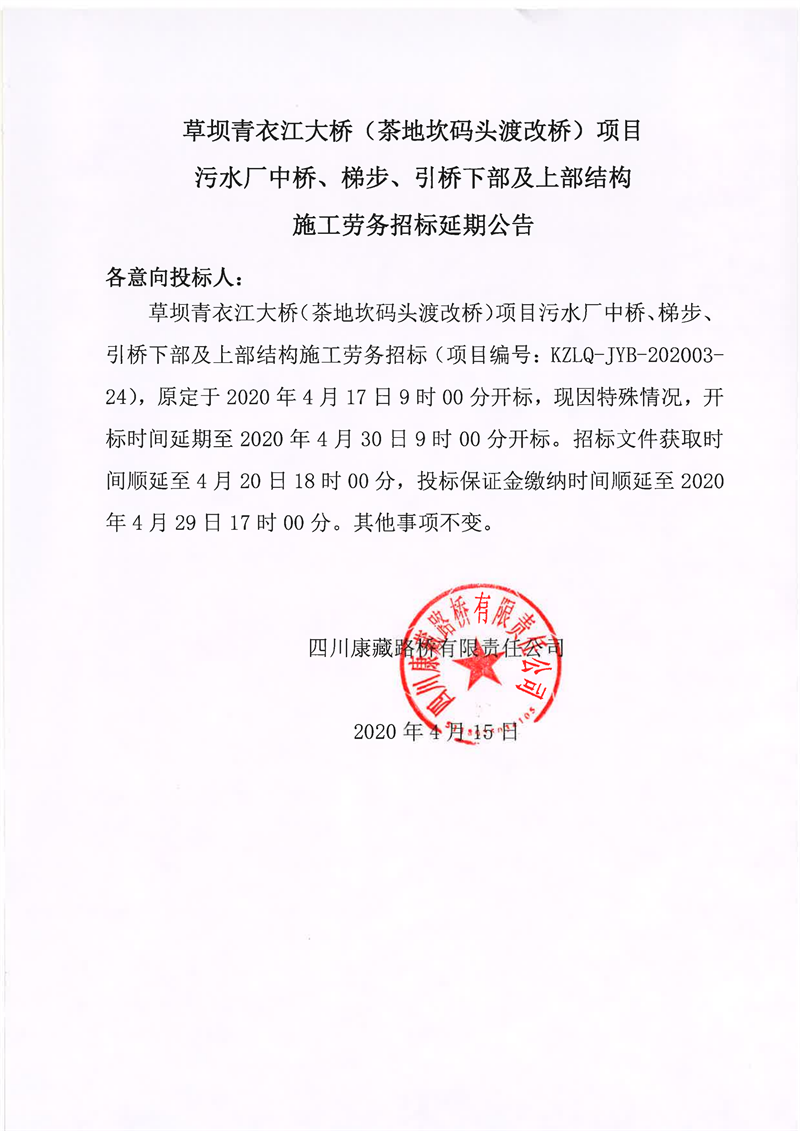 四川康藏路橋有限責(zé)任公司草壩青衣江大橋(茶地坎碼頭渡改橋)項(xiàng)目污水廠(chǎng)中橋、梯步、引橋下部及上部結(jié)構(gòu)施工勞務(wù)招標(biāo)延期公告