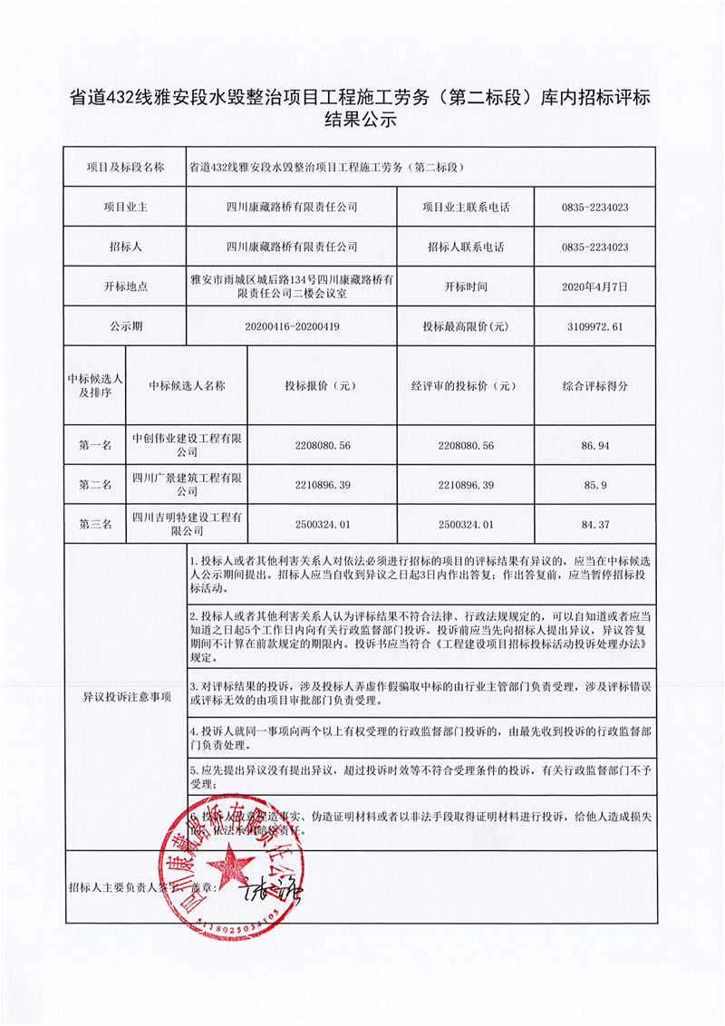 四川康藏路橋有限責(zé)任公司省道432線雅安段水毀整治項(xiàng)目工程施工勞務(wù)(第二標(biāo)段)庫內(nèi)招標(biāo)評(píng)標(biāo)結(jié)果公示
