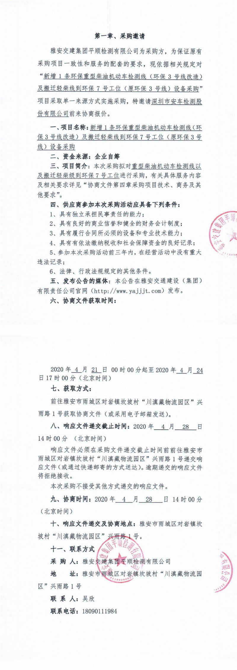 雅安交建集團(tuán)平順檢測(cè)有限公司新增1條環(huán)保重型柴油機(jī)動(dòng)車檢測(cè)線(環(huán)保3號(hào)線改造)及搬遷輕柴線到環(huán)保7號(hào)工位(原環(huán)保3號(hào)線)設(shè)備采購(gòu)單一來(lái)源協(xié)商公告