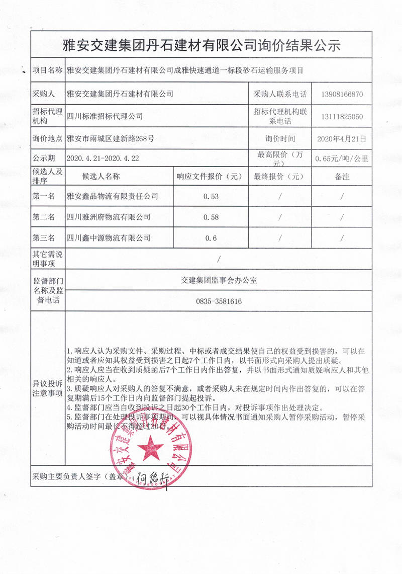 雅安交建集團丹石建材有限公司成雅快速通道一標段砂石運輸服務(wù)項目詢價結(jié)果公示