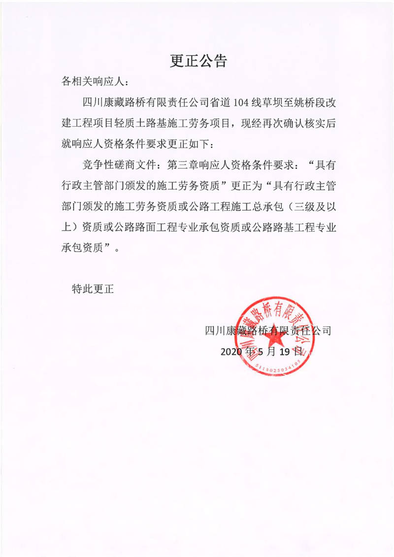 四川康藏路橋有限責(zé)任公司省道104線草壩至姚橋段改建工程項目輕質(zhì)土路基施工勞務(wù)項目更正公告
