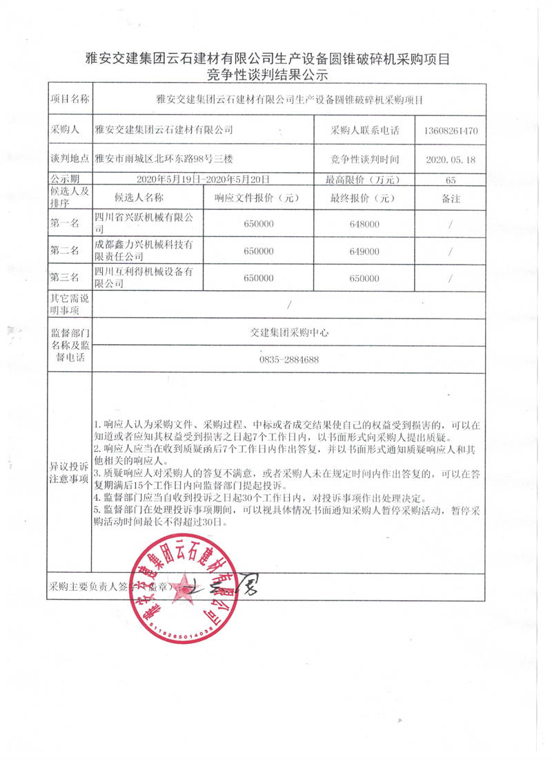 雅安交建集團(tuán)云石建材有限公司生產(chǎn)設(shè)備圓錐破碎機(jī)采購(gòu)項(xiàng)目競(jìng)爭(zhēng)性談判結(jié)果公示