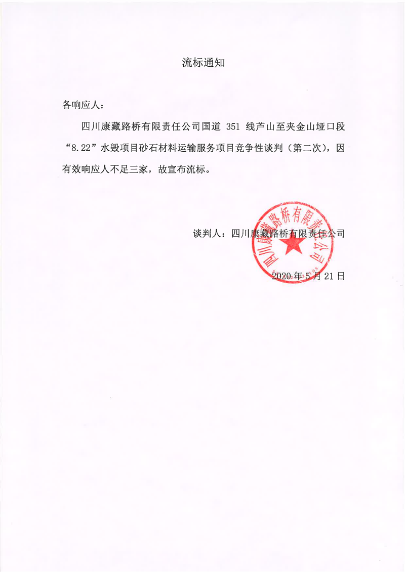 四川康藏路橋有限責任公司國道351線蘆山至夾金山埡口段8.22水毀項目砂石材料運輸服務項目(第二次)流標通知