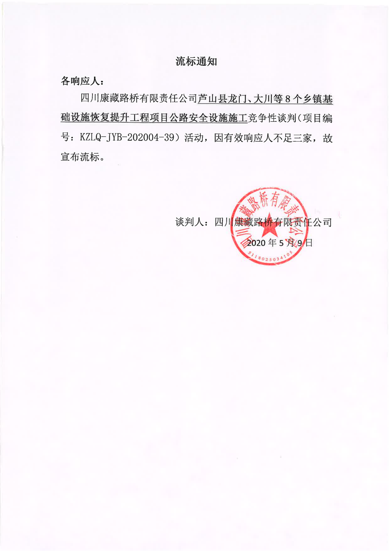 四川康藏路橋有限責任公司蘆山縣龍門、大川等8個鄉(xiāng)鎮(zhèn)基礎設施恢復提升工程項目公路安全設施施工競爭性談判流標通知