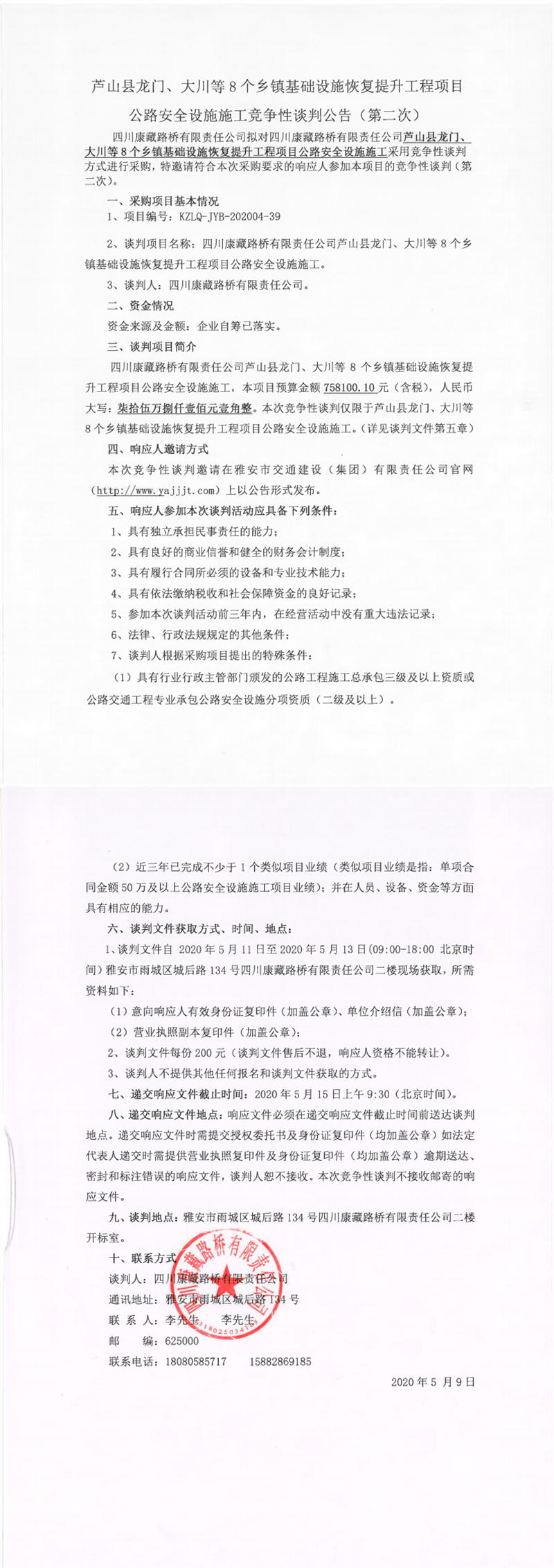 四川康藏路橋有限責(zé)任公司蘆山縣龍門、大川等8個鄉(xiāng)鎮(zhèn)基礎(chǔ)設(shè)施恢復(fù)提升工程項目公路安全設(shè)施施工競爭性談判公告(第二次)