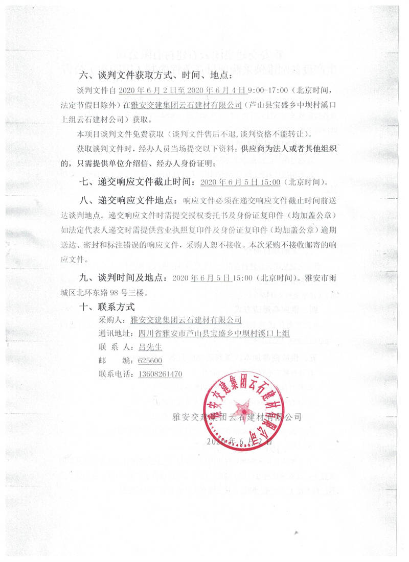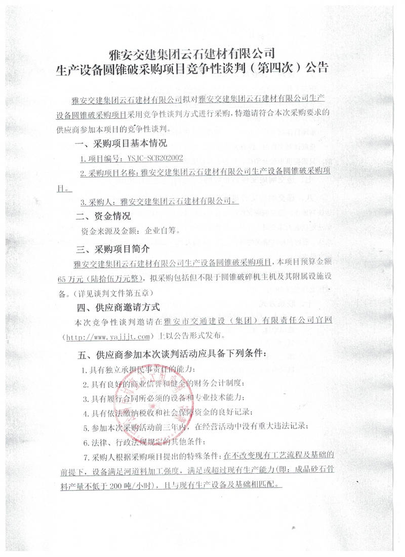 雅安交建集團(tuán)云石建材有限公司生產(chǎn)設(shè)備圓錐破采購(gòu)項(xiàng)目競(jìng)爭(zhēng)性談判(第四次)公告