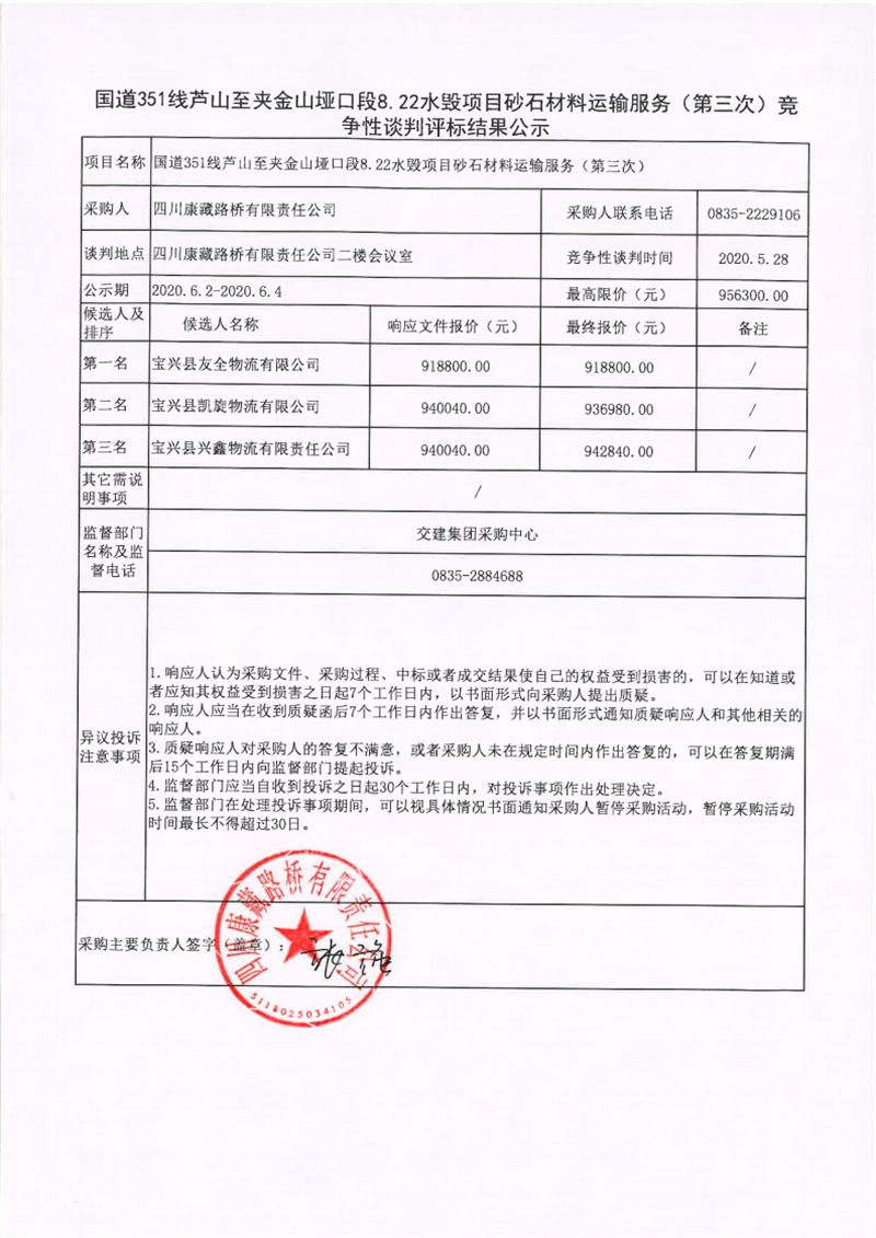 四川康藏路橋有限責(zé)任公司國道351線蘆山至夾金山埡口段8.22水毀項目砂石材料運輸服務(wù)(第三次)競爭性談判評標(biāo)結(jié)果公示