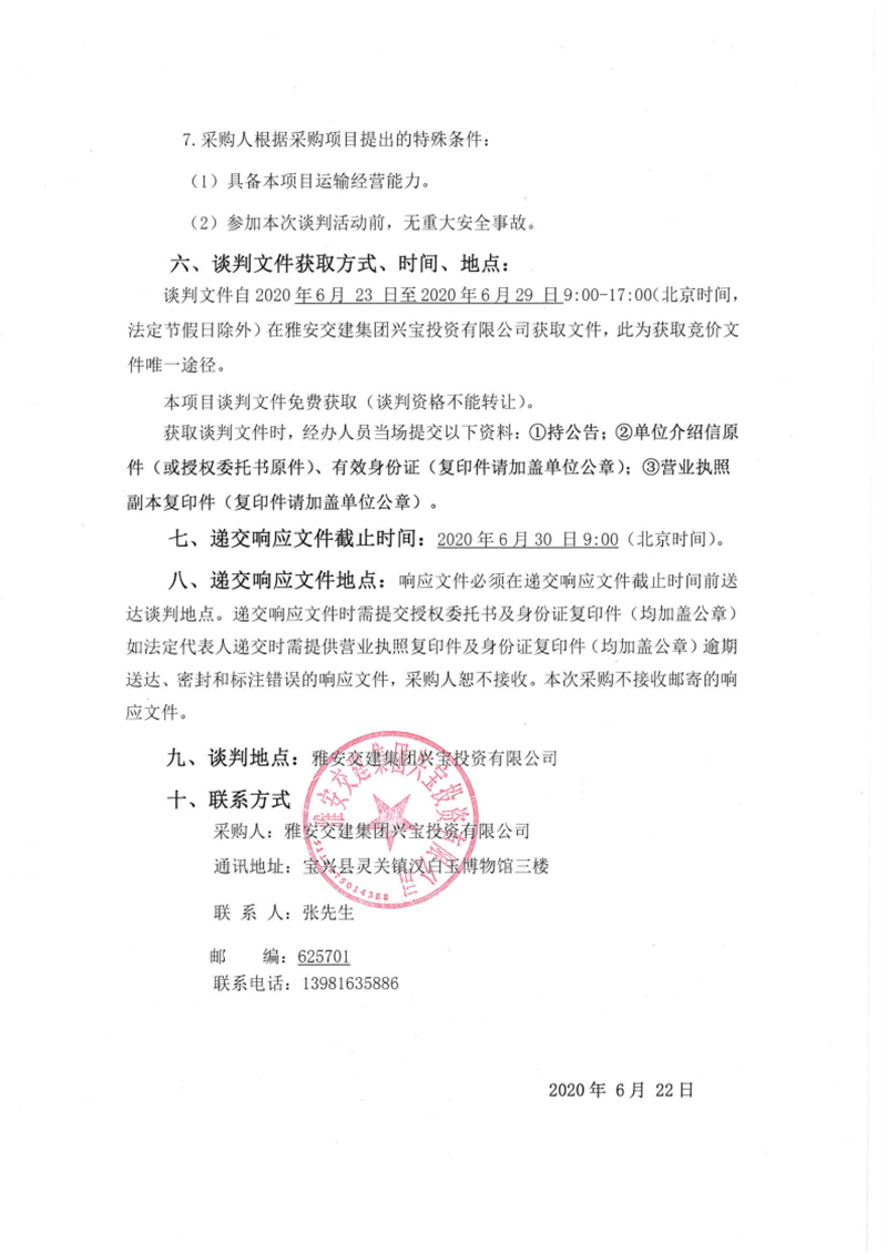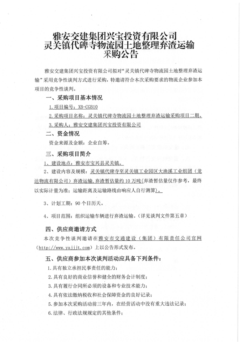雅安交建集團興寶投資有限公司靈關(guān)鎮(zhèn)代碑寺物流園土地整理棄渣運輸采購項目二期競爭性談判公告