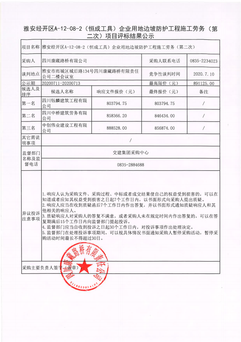 四川康藏路橋有限公司雅安經開區(qū)A-12-08-2(恒成工具)企業(yè)用地邊坡防護工程施工勞務(第二次)項目評標結果公示