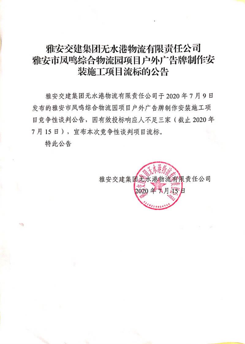 雅安交建集團(tuán)無(wú)水港物流有限責(zé)任公司雅安市鳳鳴綜合物流園項(xiàng)目戶外廣告牌制作安裝施工項(xiàng)目流標(biāo)公告