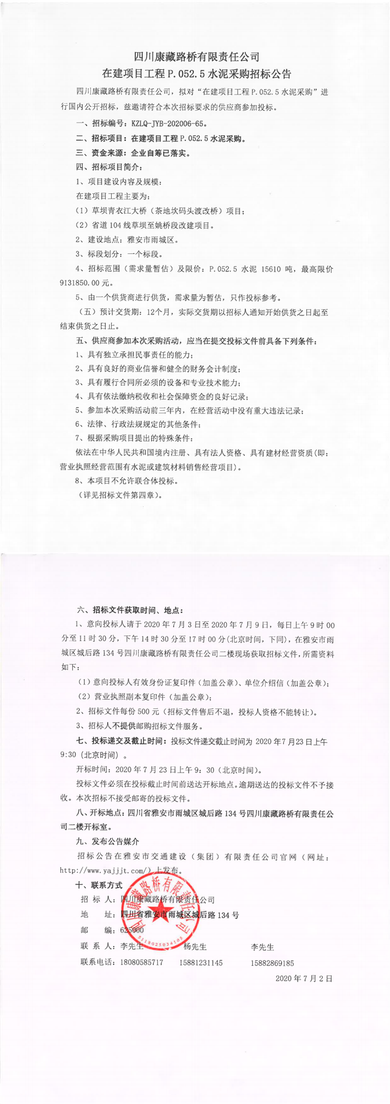 四川康藏路橋有限責(zé)任公司在建項(xiàng)目工程P.052.5水泥采購(gòu)招標(biāo)公告