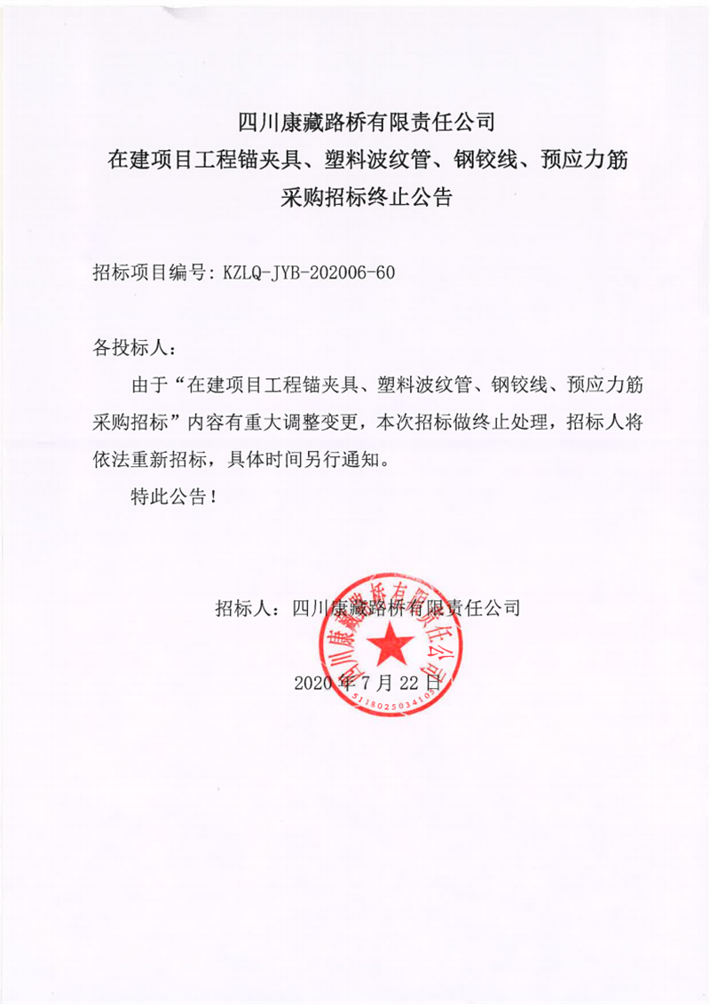 四川康藏路橋有限責(zé)任公司在建項目工程錨夾具、塑料波紋管、鋼鉸線、預(yù)應(yīng)力筋采購招標終止公告