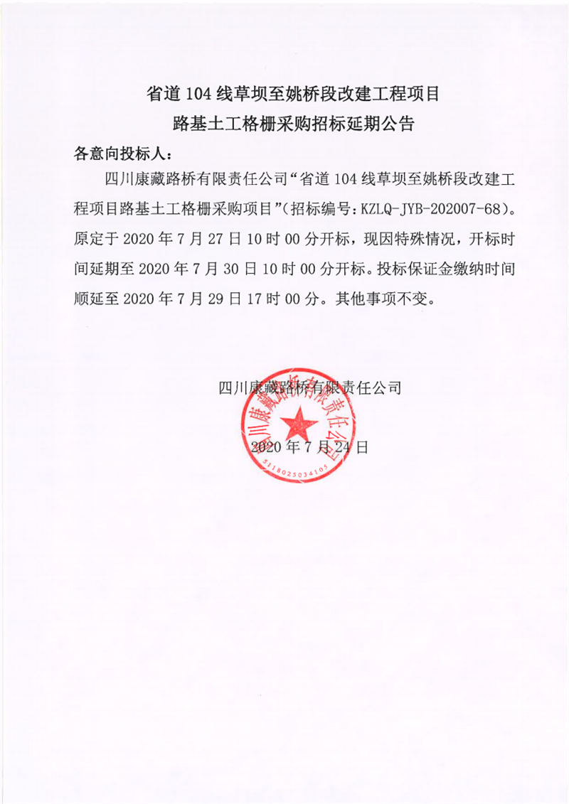 四川康藏路橋有限責(zé)任公司省道104線草壩至姚橋段改建工程項(xiàng)目路基土工格柵采購招標(biāo)延期公告