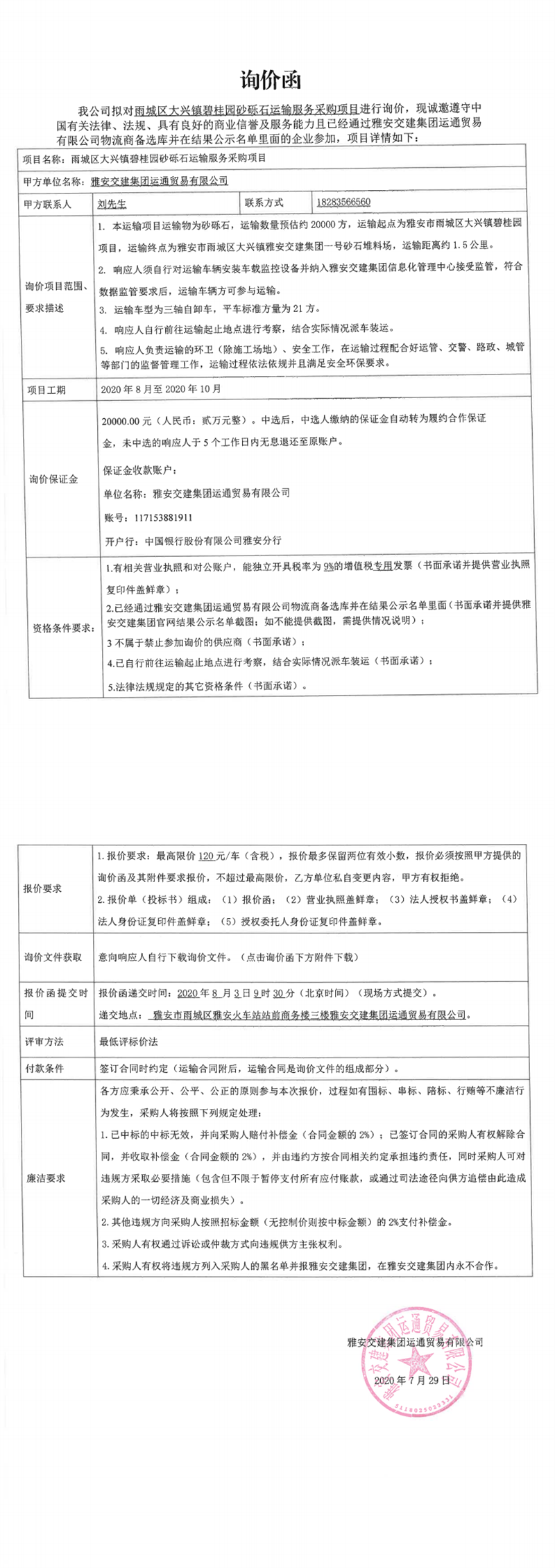 雅安交建集團(tuán)運(yùn)通貿(mào)易有限公司雨城區(qū)大興鎮(zhèn)碧桂園砂礫石運(yùn)輸服務(wù)采購(gòu)項(xiàng)目(第二次)詢價(jià)函