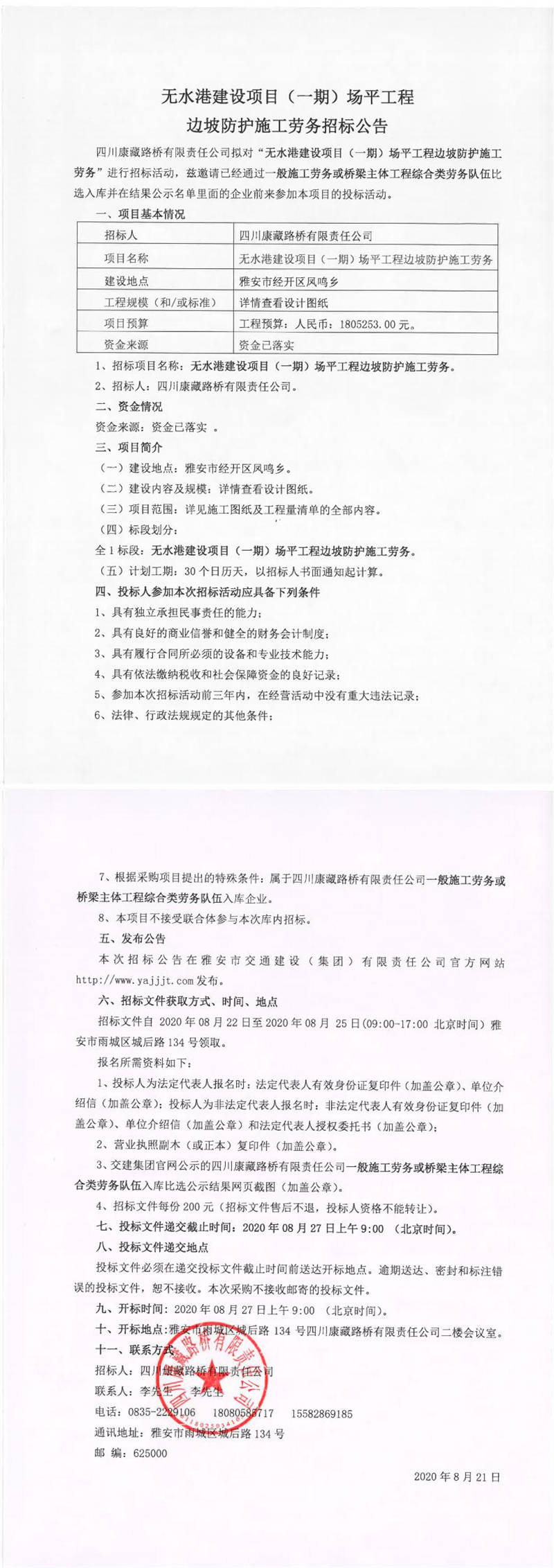 四川康藏路橋有限責(zé)任公司無水港建設(shè)項目(一期)場平工程邊坡防護施工勞務(wù)招標(biāo)公告