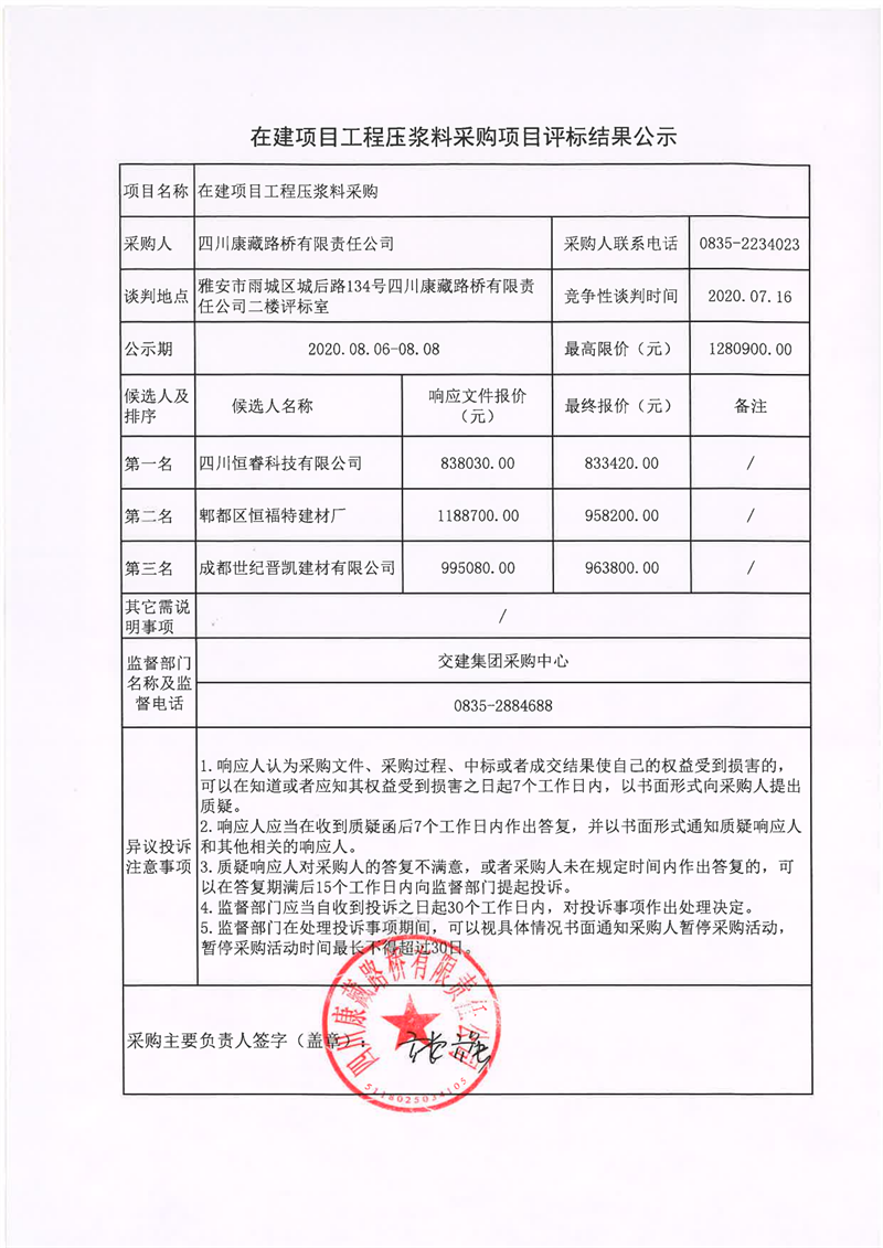四川康藏路橋有限責(zé)任公司在建項(xiàng)目工程壓漿料采購(gòu)評(píng)標(biāo)結(jié)果公示