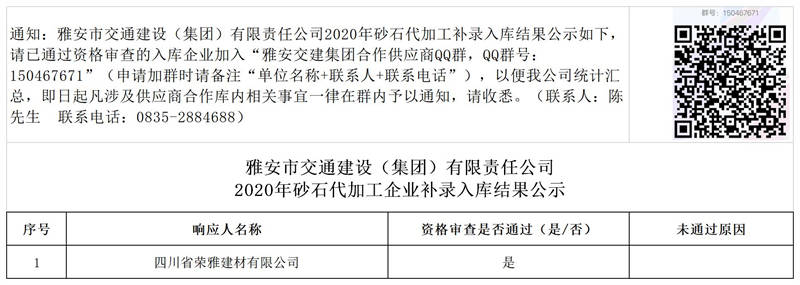 雅安市交通建設(shè)(集團(tuán))有限責(zé)任公司2020年砂石代加工企業(yè)補錄入庫結(jié)果公示