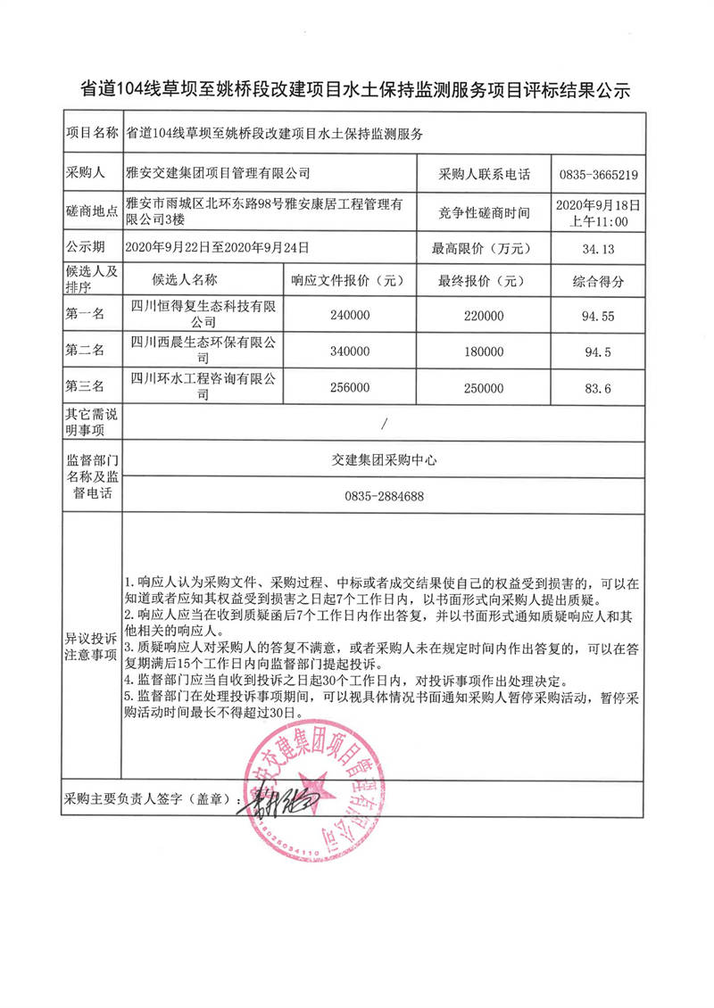 雅安交建集團(tuán)項(xiàng)目管理有限公司省道104線草壩至姚橋段改建項(xiàng)目水土保持監(jiān)測(cè)服務(wù)項(xiàng)目評(píng)標(biāo)結(jié)果公示