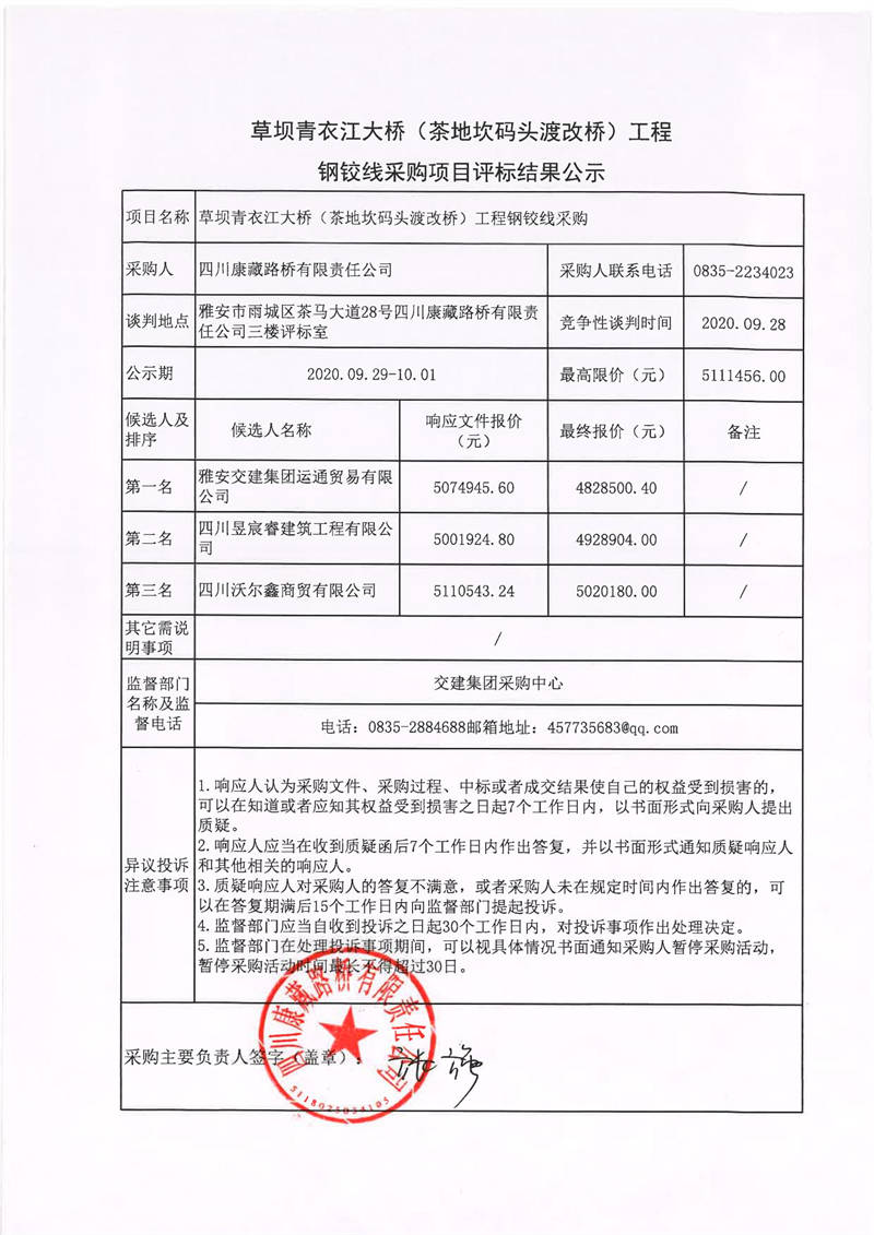 四川康藏路橋有限責任公司草壩青衣江大橋(茶地坎碼頭渡改橋)工程鋼鉸線采購項目評標結(jié)果公示