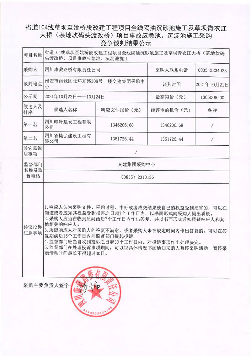 四川康藏路橋有限責(zé)任公司省道104線草壩至姚橋段改建工程項(xiàng)目全線隔油沉砂池施工及草壩青衣江大橋(茶地坎碼頭渡改橋)項(xiàng)目事故應(yīng)急池、沉淀池施工采購(gòu)競(jìng)爭(zhēng)談判結(jié)果公示